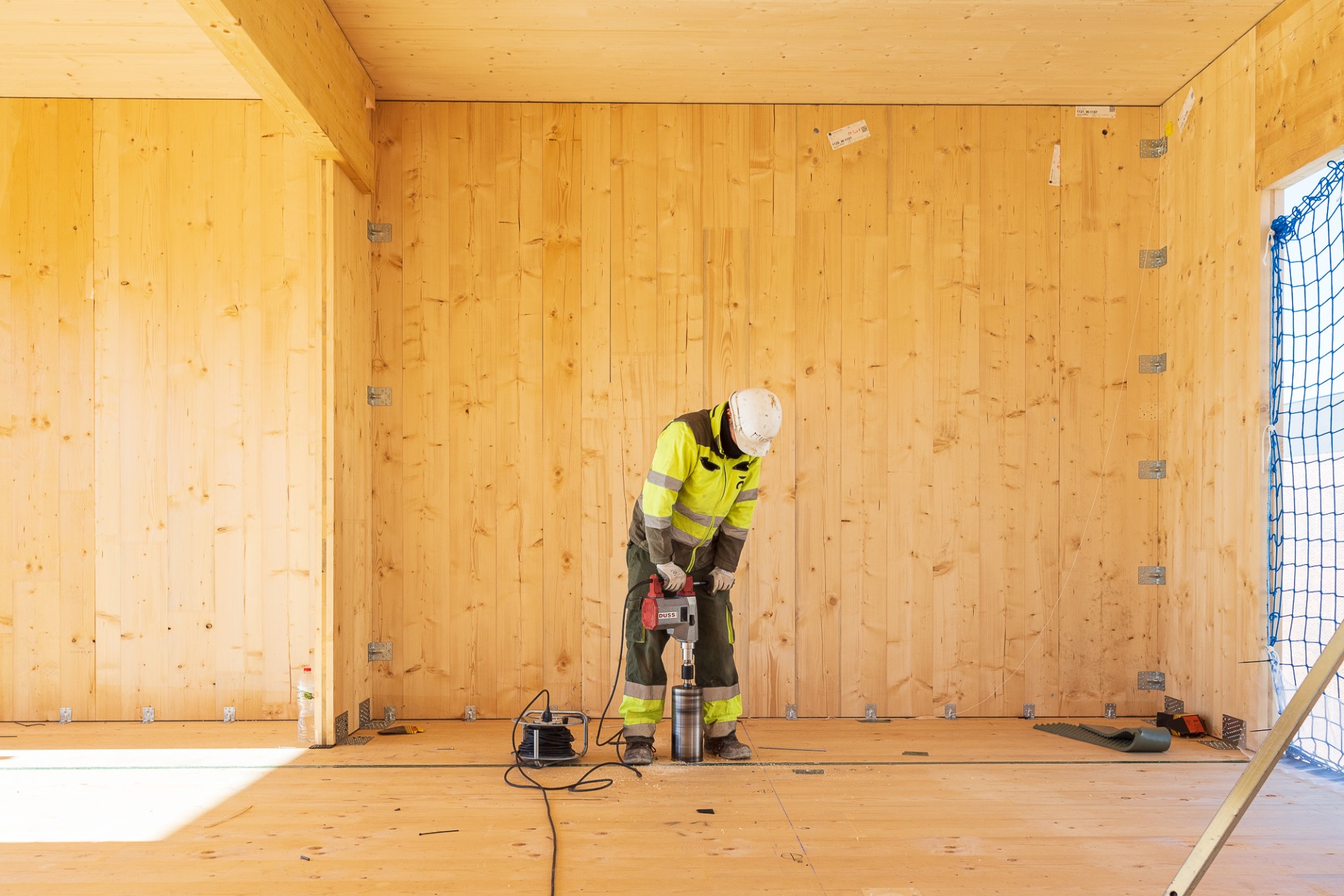 Gracias a la ejecución de la estructura con CLT, los equipos de Constraula han podido trabajar con plantas diáfanas, que se alejan de los puntales convencionales presentes en la estructura de hormigón armado. De este modo, se han ejecutado de forma ágil los trasdosados de pladur hasta la 7ª planta y se han podido avanzar considerablemente las instalaciones hasta la 5ª planta.