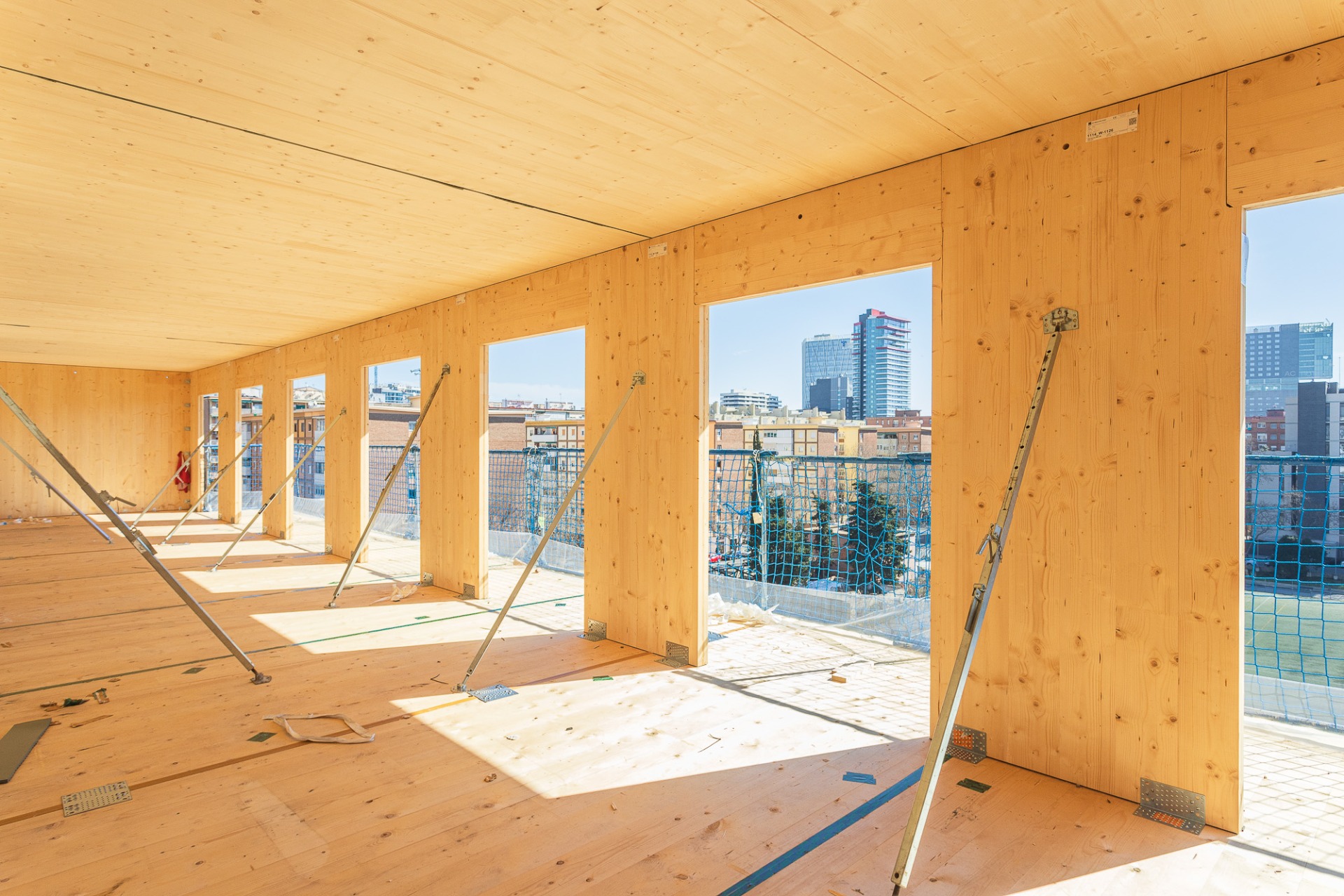 Las obras de construcción industrializada del edificio de 42 viviendas de madera sostenible que ejecuta Constraula en la calle Pallars, en el distrito de Sant Martí de Barcelona, avanzan a buen ritmo y ya se encuentran en la semana 23 de ejecución.