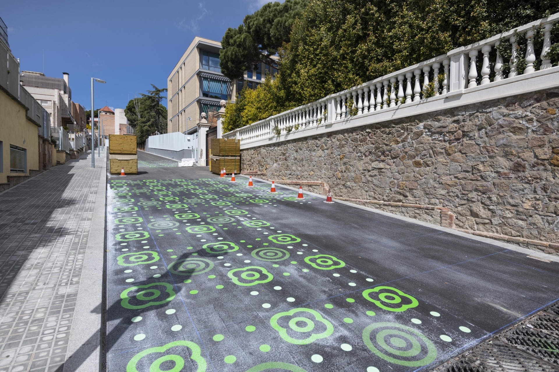 En el pasaje Torras i Bages, se plantea una pacificación del vial. Se restringe la circulación de vehículos a vecinos que tienen vados y servicios mediante la instalación de jardineras, sillas y bolardos de hormigón. Para remarcar la prioridad de los niños se realizan pinturas tácticas en diferentes tonos de verde que representan panots.