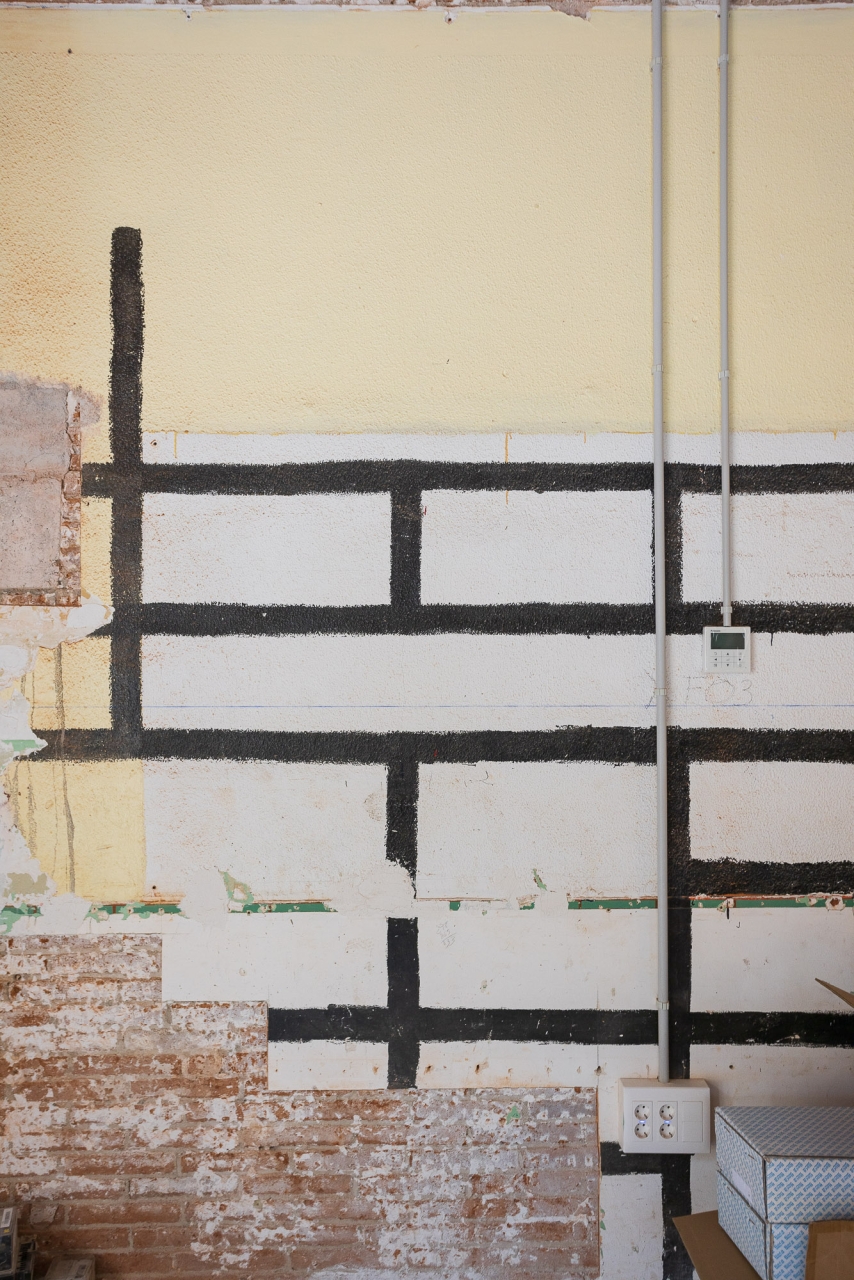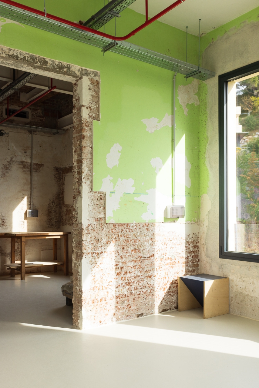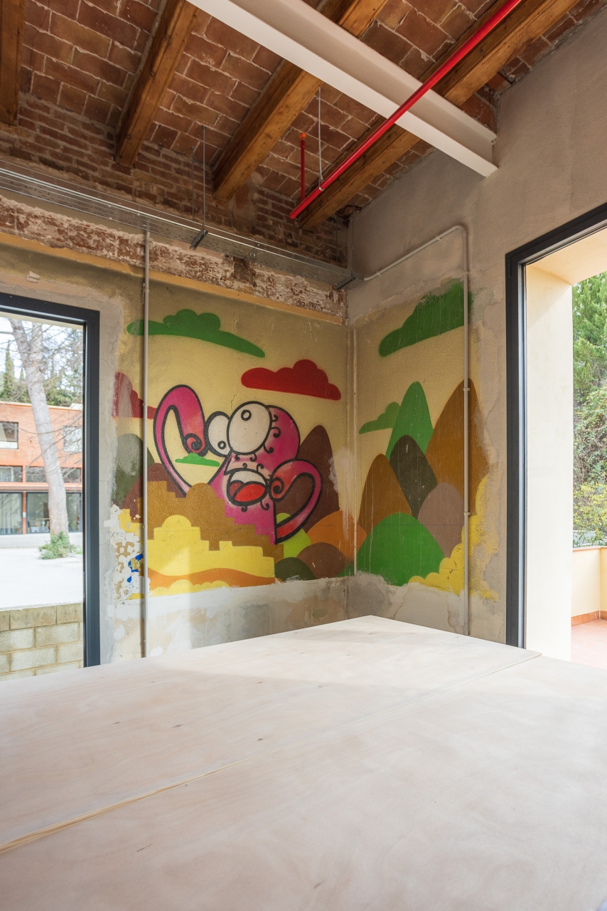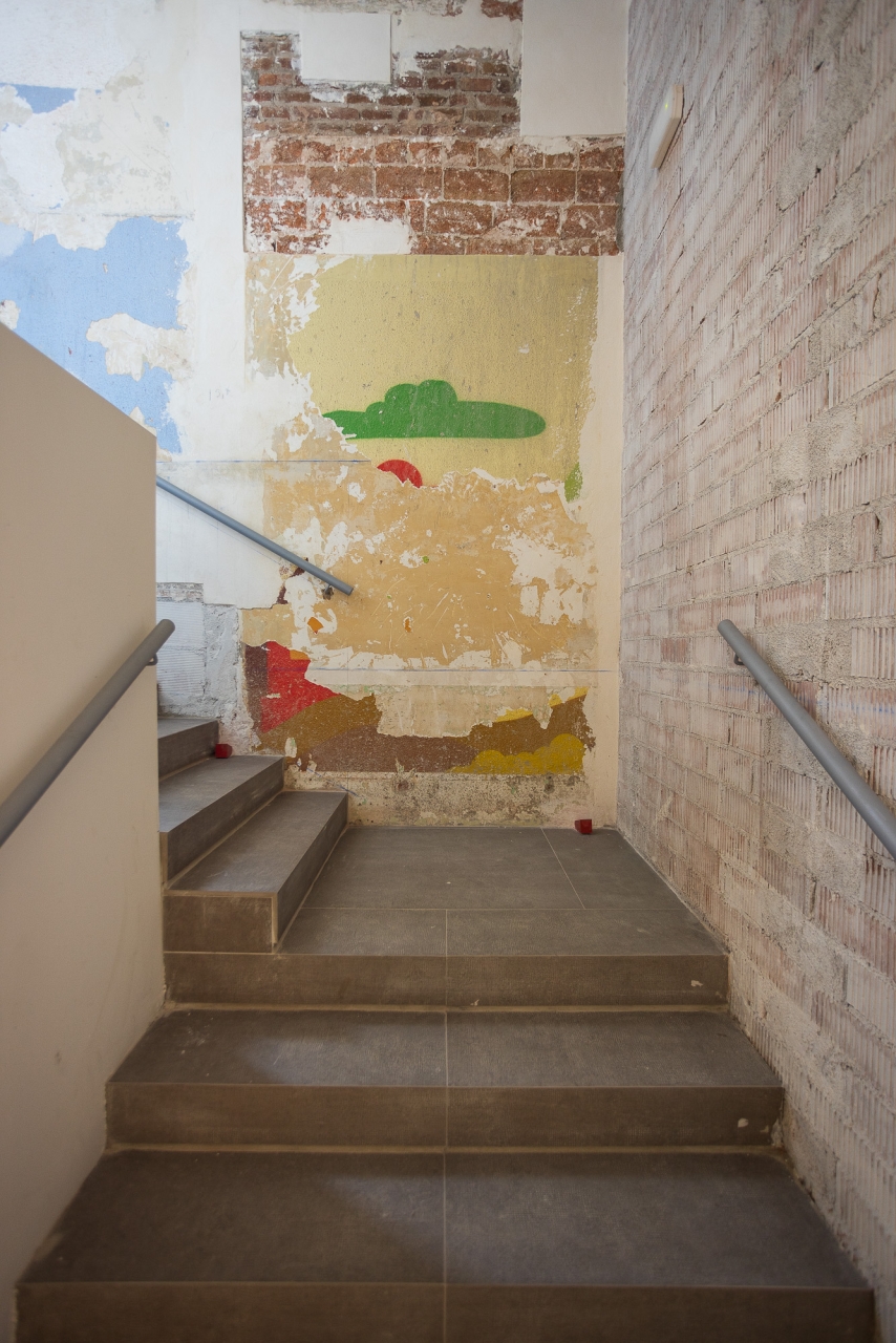 Alguns objectes trobats en iniciar les obres – com a dibuixos a les parets i retallades de cors enganxats als murs originals – es conserven com a petjades del passat. De la mateixa manera, s’han deixat alguns senyals recents com ara les marques que pintaven els operaris per anar deixant constància de l’avenç dels treballs o la línia blava que servia de guia per marcar el nivell. D’aquesta manera, els que recorrin els passadissos d’ara endavant podran fer una immersió total en el procés constructiu i impregnar-se d’un ambient disposat per a la creativitat.
