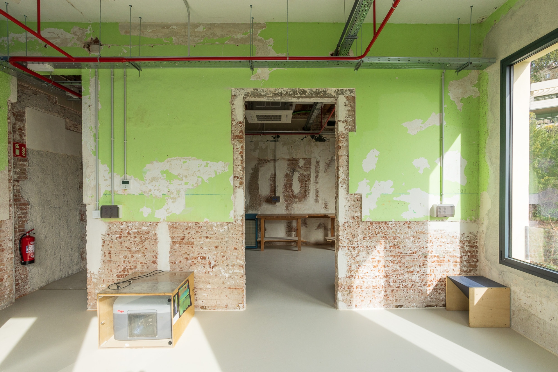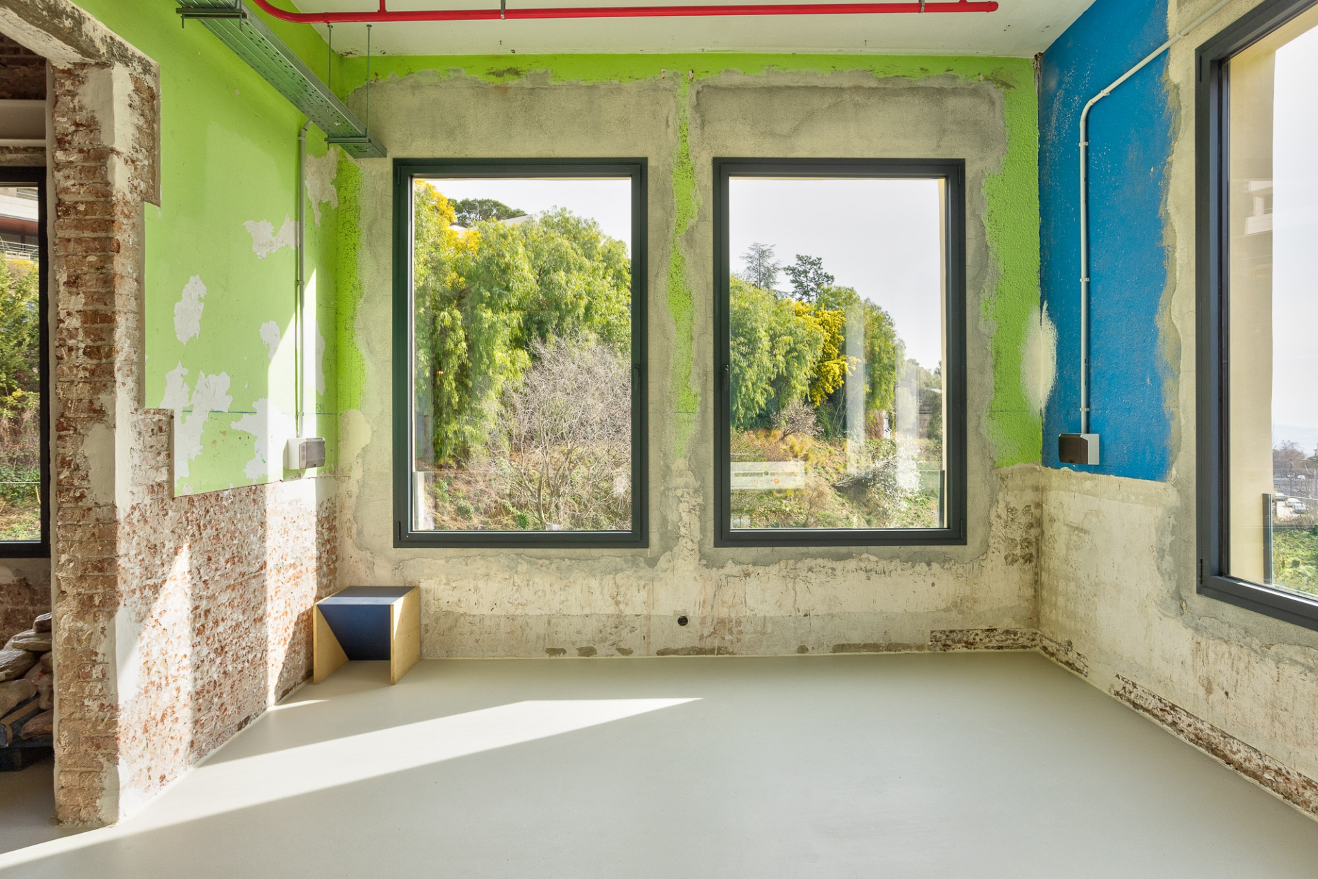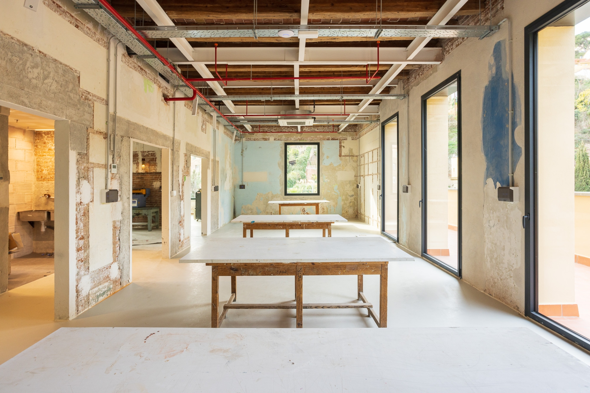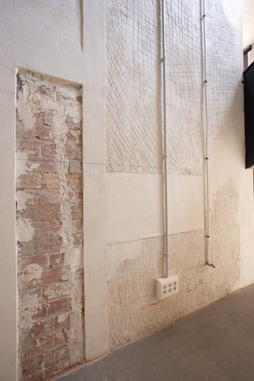 Alguns objectes trobats en iniciar les obres – com a dibuixos a les parets i retallades de cors enganxats als murs originals – es conserven com a petjades del passat. De la mateixa manera, s’han deixat alguns senyals recents com ara les marques que pintaven els operaris per anar deixant constància de l’avenç dels treballs o la línia blava que servia de guia per marcar el nivell. D’aquesta manera, els que recorrin els passadissos d’ara endavant podran fer una immersió total en el procés constructiu i impregnar-se d’un ambient disposat per a la creativitat.