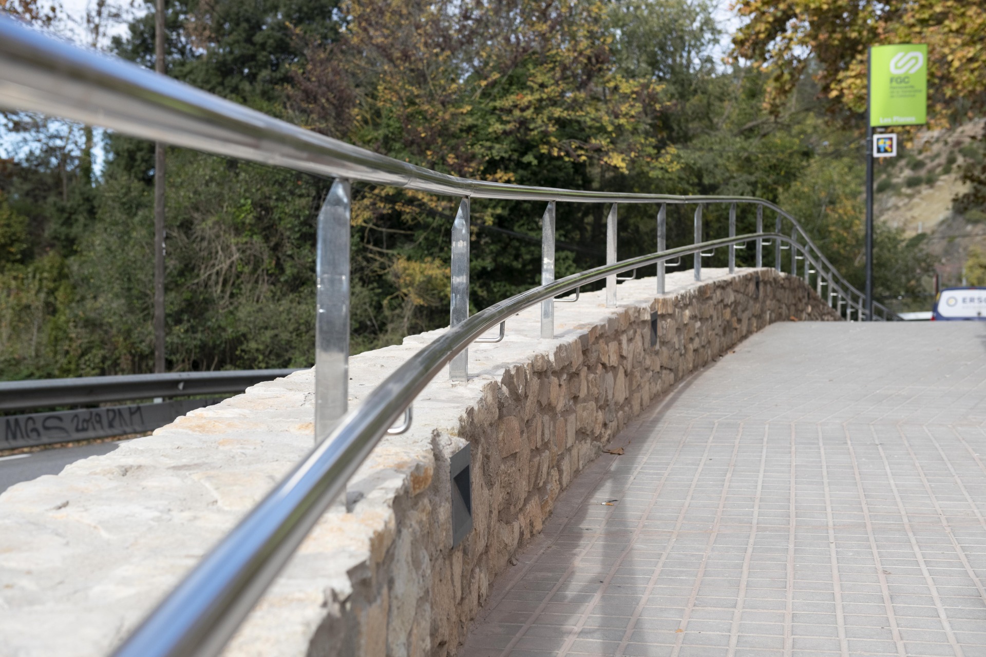 A l’accés principal a l’estació, s’eliminen les escales i es creen dues rampes amb acabat de formigó rentat a l’àcid rematades amb un mur de pedra tocant la carretera.